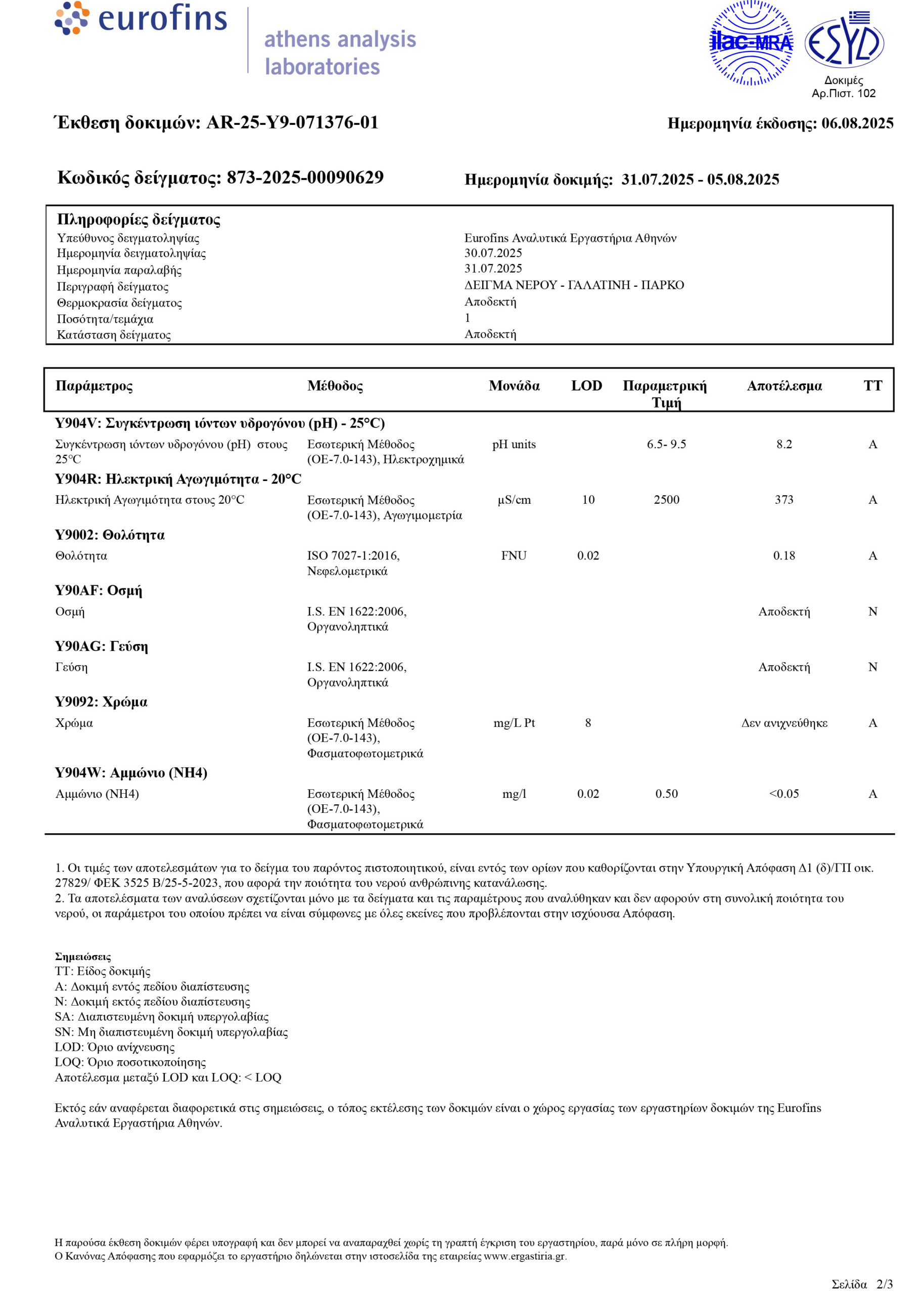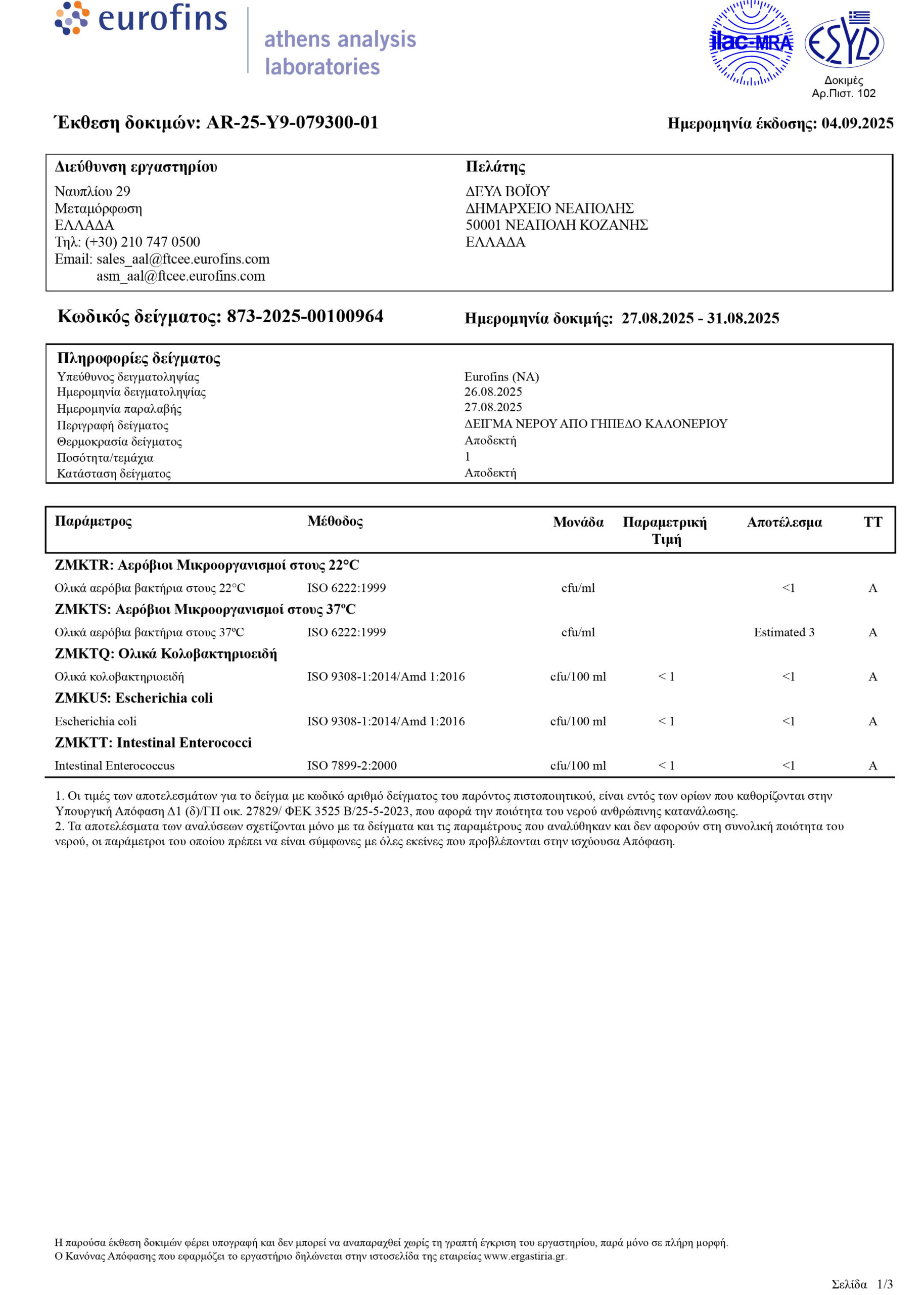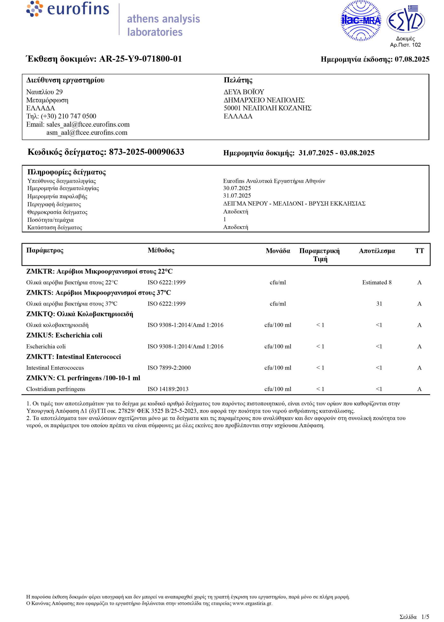 ΣΤΑ ΠΛΑΙΣΙΑ ΤΩΝ ΤΑΚΤΙΚΩΝ ΔΕΙΓΜΑΤΟΛΗΠΤΙΚΩΝ ΕΛΕΓΧΩΝ ΠΟΥ ΠΡΑΓΜΑΤΟΠΟΙΕΙ Η Δ.Ε.Υ.Α. ΒΟΪΟΥ, ΓΙΑ ΤΗΝ ΔΙΑΣΦΑΛΙΣΗ ΤΗΣ ΠΟΙΟΤΗΤΑΣ ΤΟΥ ΠΑΡΕΧΟΜΕΝΟΥ ΝΕΡΟΥ ΚΑΙ ΤΗΝ ΑΜΕΣΗ ΕΝΗΜΕΡΩΣΗ ΤΩΝ ΚΑΤΑΝΑΛΩΤΩΝ, ΣΑΣ ΚΟΙΝΟΠΟΙΟΎΜΕ ΤΑ ΑΠΟΤΕΛΕΣΜΑΤΑ ΕΛΕΓΚΤΙΚΗΣ ΠΑΡΑΚΟΛΟΥΘΗΣΗΣ (Ομάδα ΄Β) ΠΟΣΙΜΟΥ ΝΕΡΟΥ ΤΟΥ ΔΙΚΤΥΟΥ ΥΔΡΕΥΣΗΣ ΑΡΜΟΔΙΟΤΗΤΑΣ Δ.Ε.Υ.Α. ΒΟΪΟΥ ΠΟΥ ΠΑΡΘΗΚΑΝ ΑΠΟ ΤΗΝ ΚΟΙΝΟΤΗΤΑ ΣΙΑΤΙΣΤΑ, ΓΑΛΑΤΙΝΗ, ΤΣΟΤΥΛΙ, ΠΥΛΩΡΙ, ΜΕΛΙΔΟΝΙ, ΔΡΥΟΒΟΥΝΟ, ΚΑΛΟΝΕΡΙ ΚΑΙ ΠΕΛΕΚΑΝΟ.