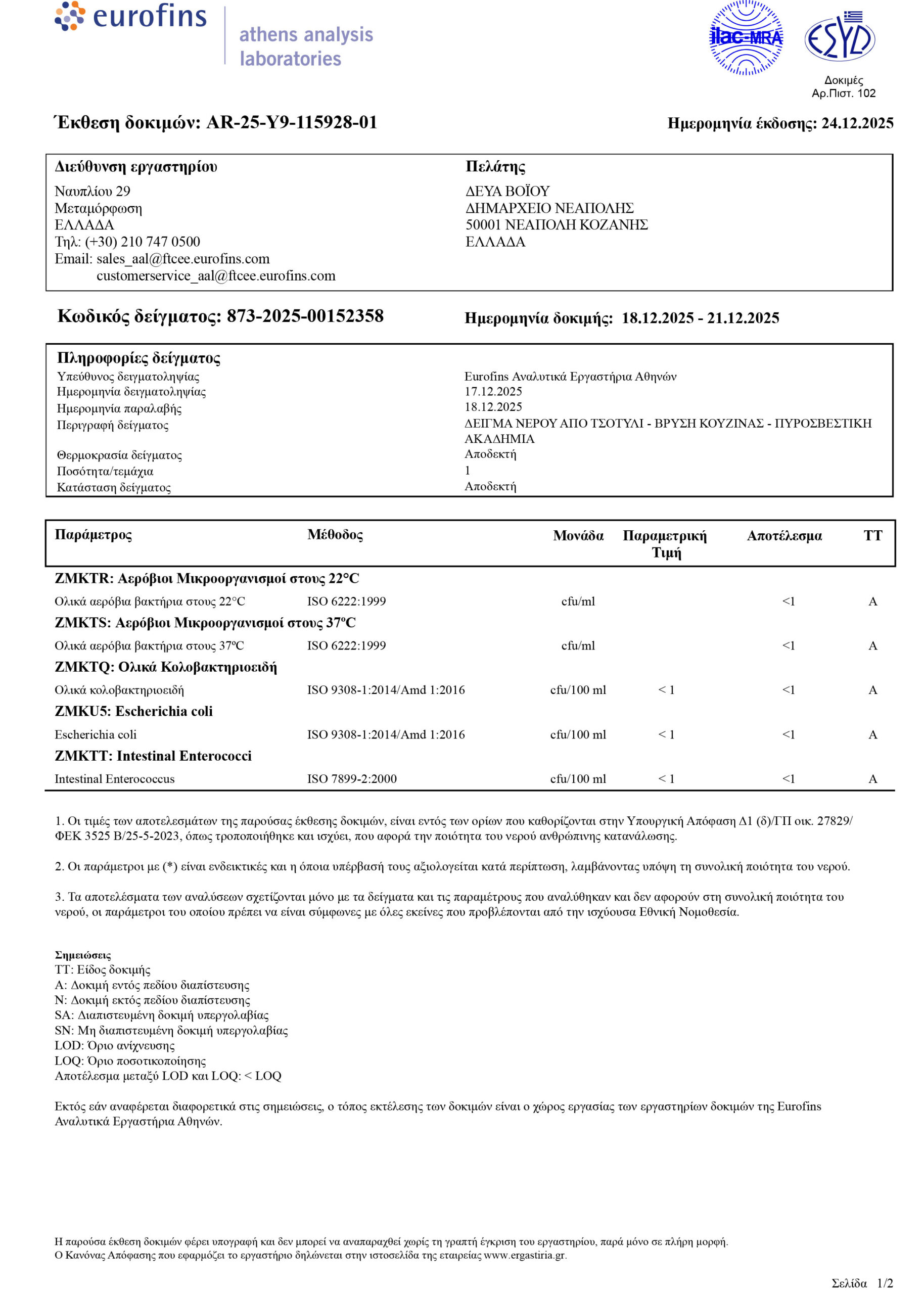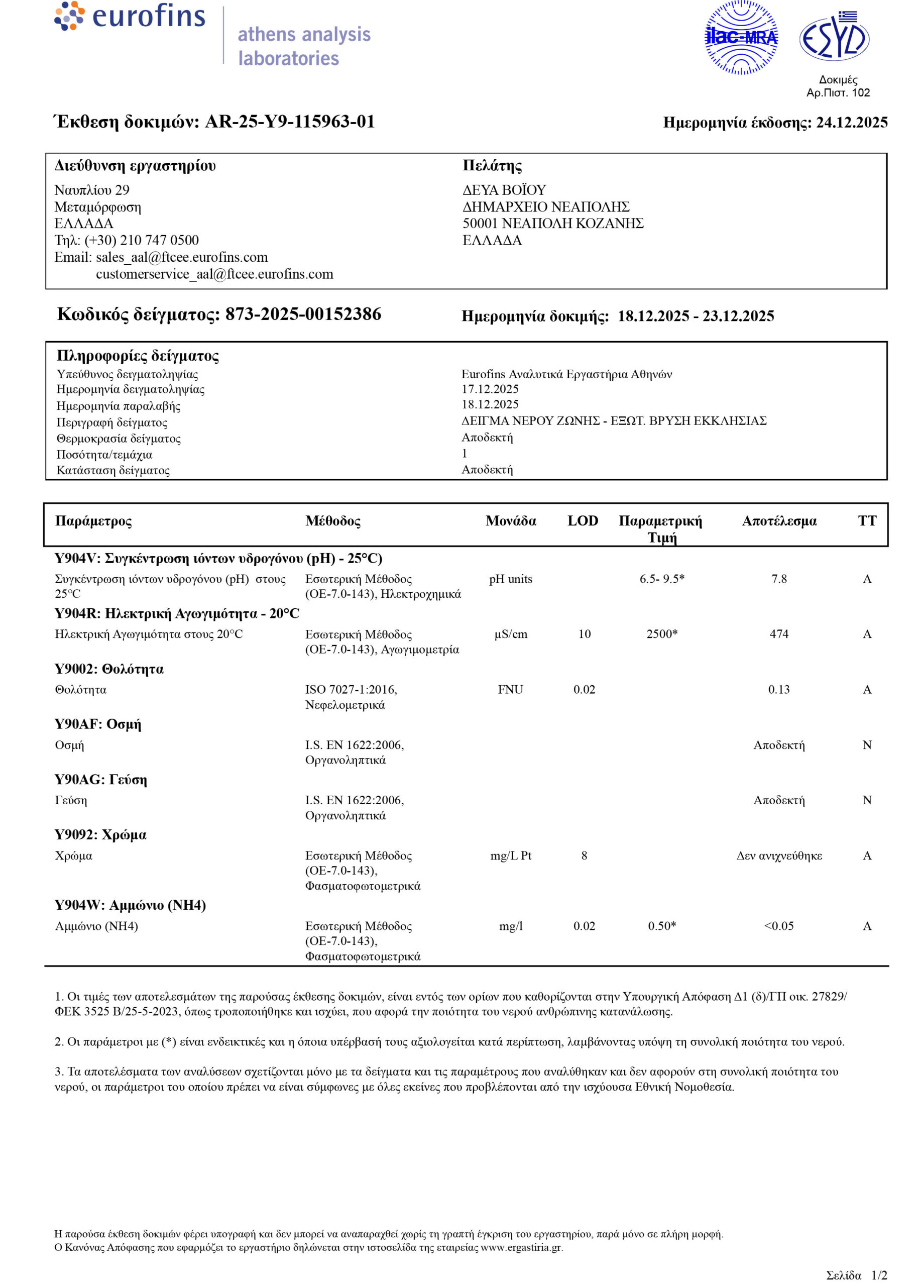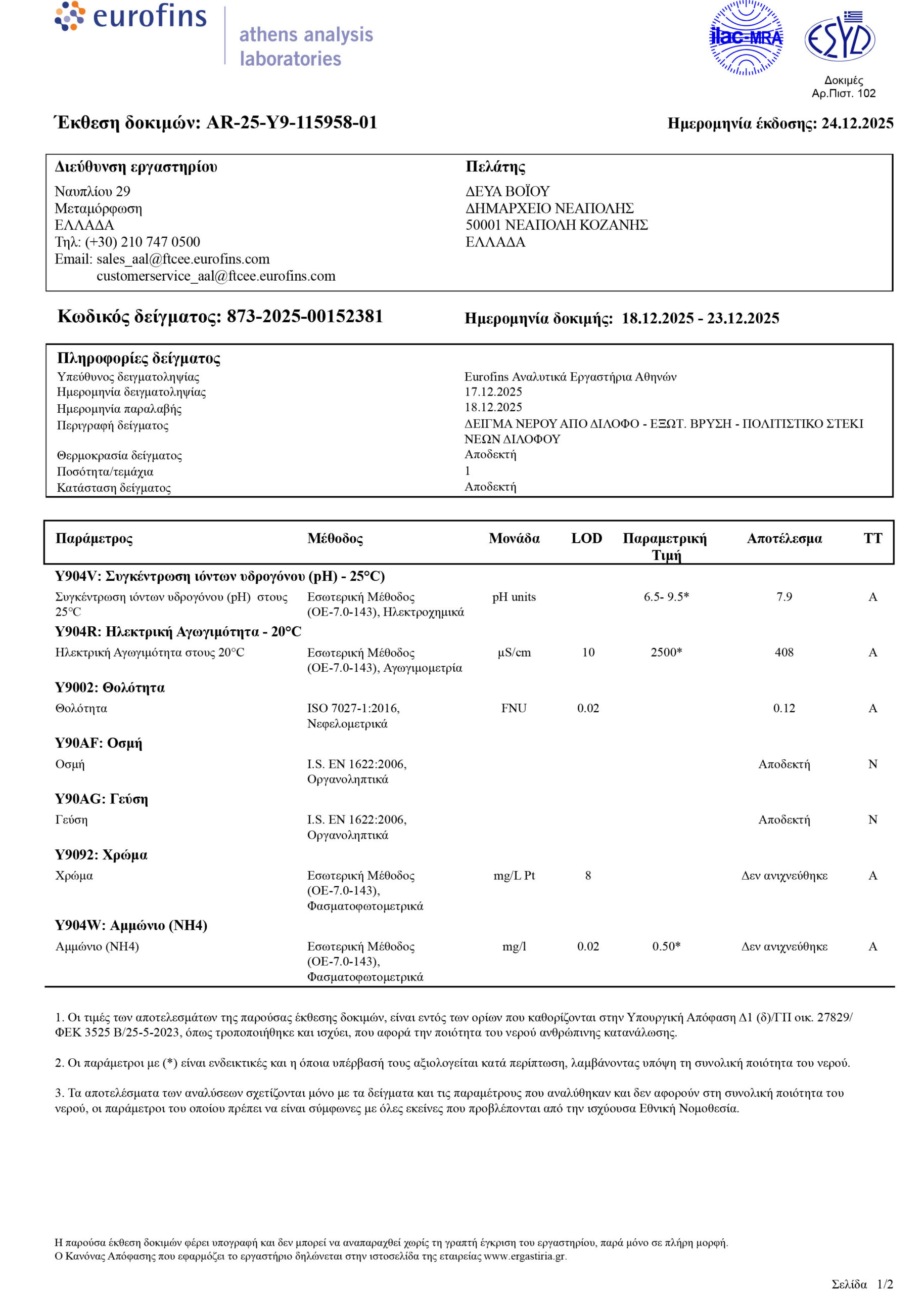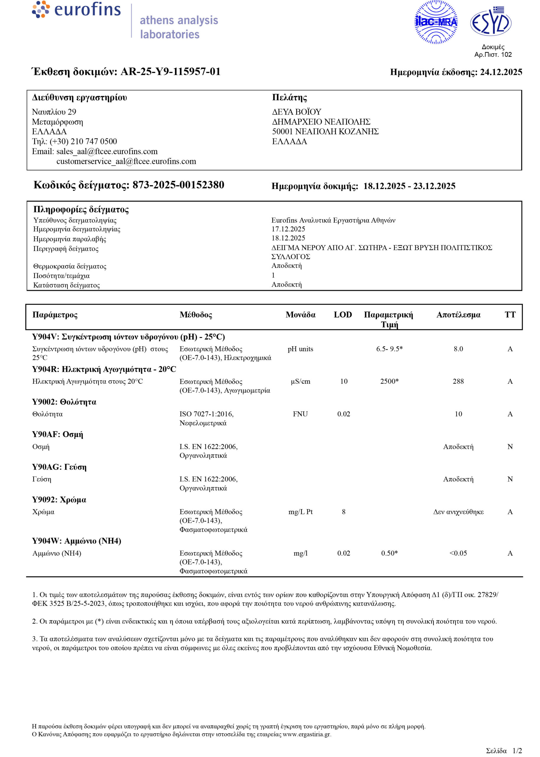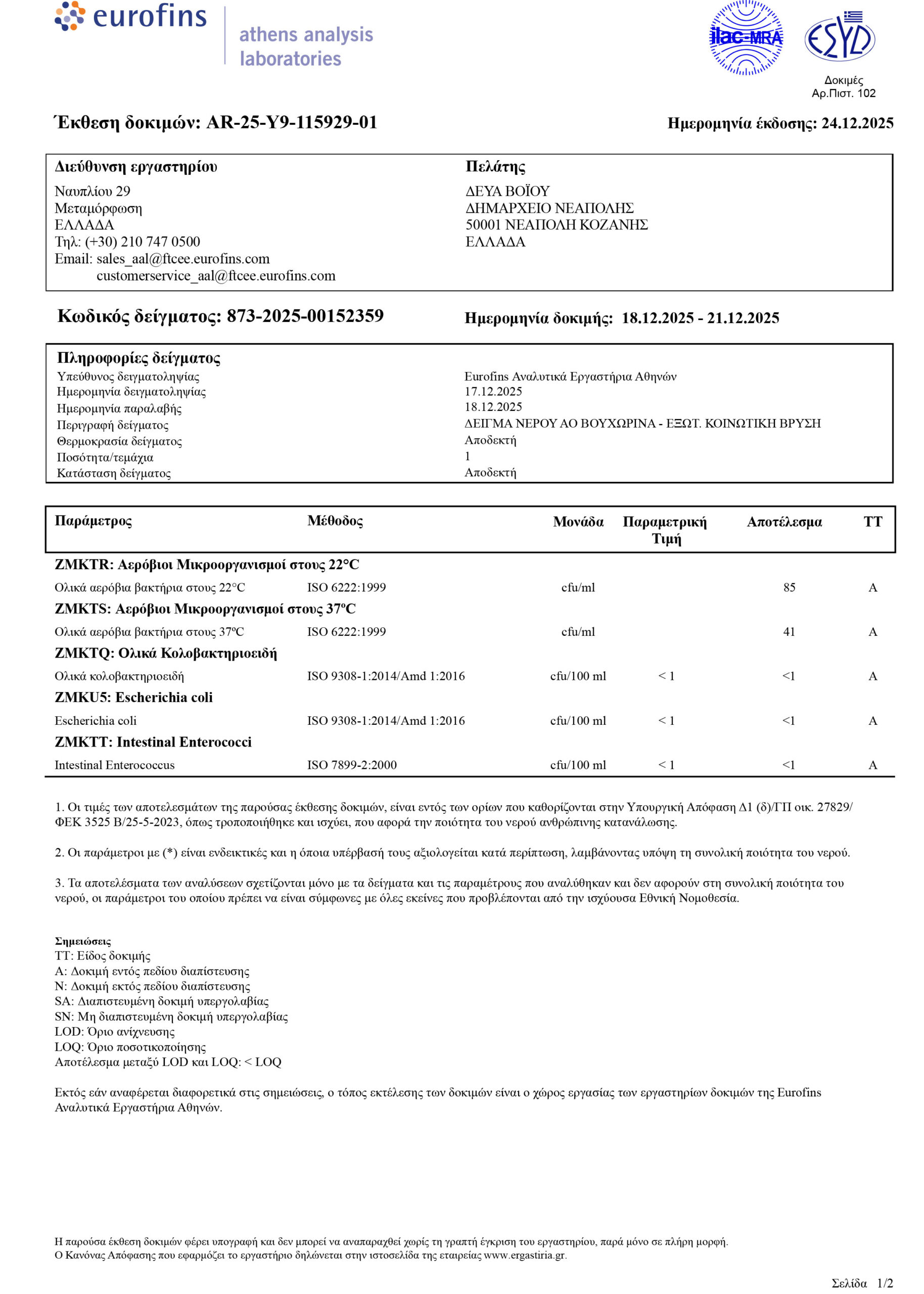ΣΤΑ ΠΛΑΙΣΙΑ ΤΩΝ ΤΑΚΤΙΚΩΝ ΔΕΙΓΜΑΤΟΛΗΠΤΙΚΩΝ ΕΛΕΓΧΩΝ ΠΟΥ ΠΡΑΓΜΑΤΟΠΟΙΕΙ Η Δ.Ε.Υ.Α. ΒΟΪΟΥ, ΓΙΑ ΤΗΝ ΔΙΑΣΦΑΛΙΣΗ ΤΗΣ ΠΟΙΟΤΗΤΑΣ ΤΟΥ ΠΑΡΕΧΟΜΕΝΟΥ ΝΕΡΟΥ ΚΑΙ ΤΗΝ ΑΜΕΣΗ ΕΝΗΜΕΡΩΣΗ ΤΩΝ ΚΑΤΑΝΑΛΩΤΩΝ, ΣΑΣ ΚΟΙΝΟΠΟΙΟΎΜΕ ΤΑ ΑΠΟΤΕΛΕΣΜΑΤΑ ΕΛΕΓΚΤΙΚΗΣ ΠΑΡΑΚΟΛΟΥΘΗΣΗΣ ΠΟΣΙΜΟΥ ΝΕΡΟΥ ΤΟΥ ΔΙΚΤΥΟΥ ΥΔΡΕΥΣΗΣ ΑΡΜΟΔΙΟΤΗΤΑΣ Δ.Ε.Υ.Α. ΒΟΪΟΥ ΠΟΥ ΠΑΡΘΗΚΑΝ ΑΠΟ ΤΗΝ ΚΟΙΝΟΤΗΤΑ ΣΙΑΤΙΣΤΑ, ΓΑΛΑΤΙΝΗ, ΤΣΟΤΥΛΙ, ΝΕΑΠΟΛΗ, ΑΥΓΕΡΙΝΟΣ, ΒΟΥΧΩΡΙΝΑ, ΒΥΘΟΣ, ΔΑΜΑΣΚΗΝΙΑ, ΔΙΛΟΦΟΣ, ΔΡΑΓΑΣΙΑ, ΖΩΝΗ, ΚΟΡΥΦΗ, ΠΕΝΤΑΛΟΦΟΣ, ΠΟΛΥΚΑΣΤΑΝΟ, ΧΡΥΣΑΥΓΗ.